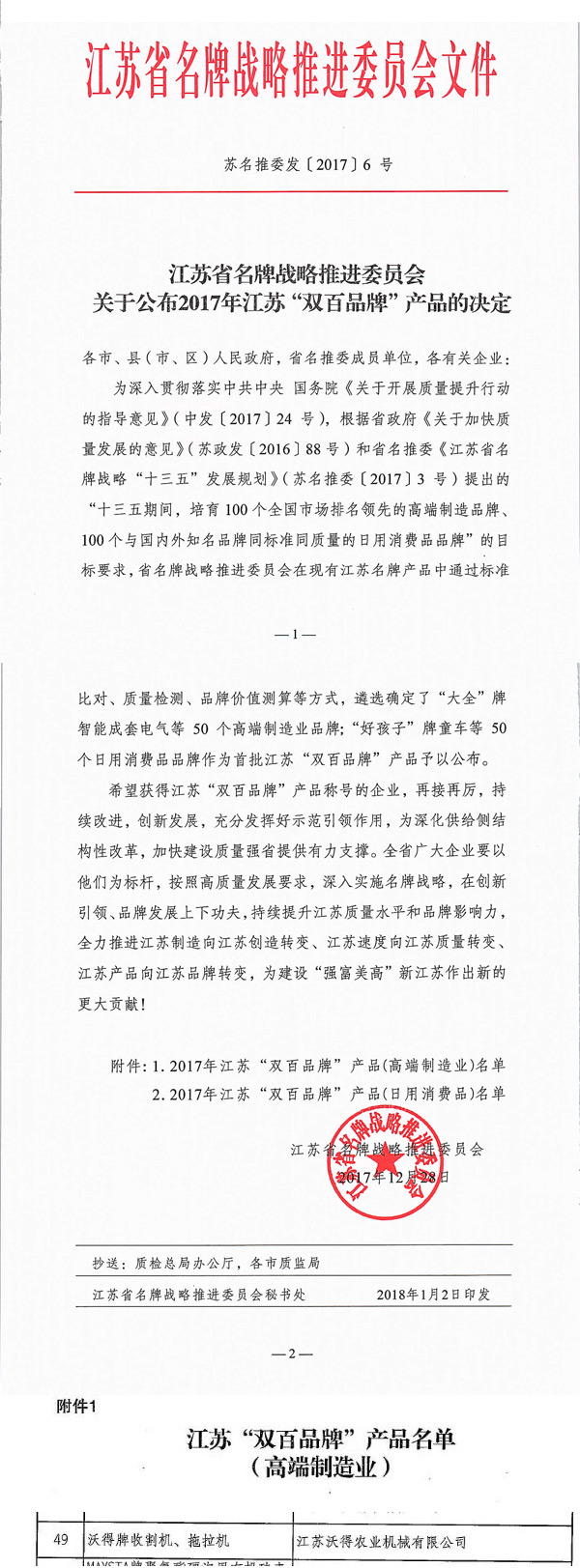 2018年1月2日,江蘇省名牌戰(zhàn)略推進(jìn)委員會公布了江蘇省“雙百品牌”產(chǎn)品名單,我集團(tuán)下屬子公司江蘇沃得農(nóng)業(yè)機(jī)械有限公司生產(chǎn)的沃得牌收割機(jī)、拖拉機(jī)榮獲江蘇省“雙百品牌”產(chǎn)品稱號。